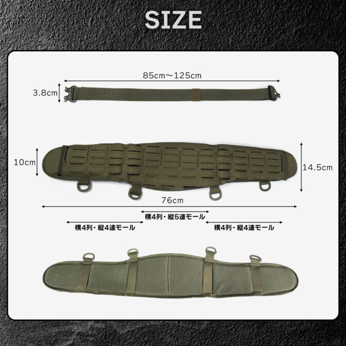 コブラベルトは全長85~125cmで、幅広い体型に対応可能。さらにパッド部分は76cm設計でしっかりと腰をサポートします。推奨ウエストサイズは80~115cmとなっており、フィット感と快適性を両立。サバゲーやアウトドアで長時間使用してもズレにくく安定感抜群。体格に合わせた調整ができるため、男性はもちろん女性ユーザーにもおすすめです。