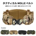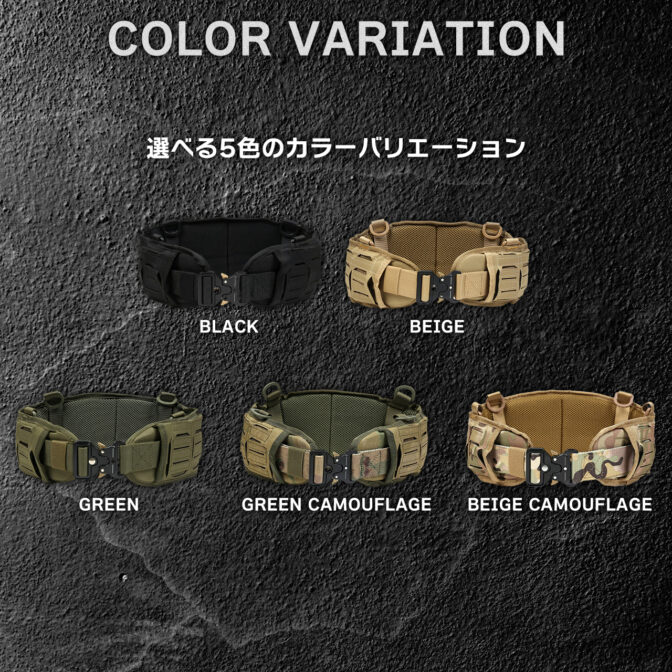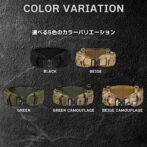 本タクティカルベルトは、サバゲーやアウトドア装備に最適な ブラック・グリーン・ベージュ・ベージュカモフラージュ・グリーンカモフラージュ の5色展開。森林戦や砂漠戦などフィールドに合わせて選べるため、迷彩服やミリタリーギアとの相性も抜群です。MOLLE対応で多機能ポーチも装着可能、サバゲーやアウトドア、ミリタリー装備として幅広く活用できる、実用性とデザイン性を兼ね備えたタクティカルベルトです。