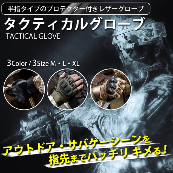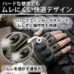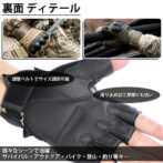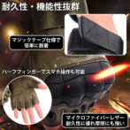 | ハーフフィンガーで指先を使いやすいく、スマホ操作もOK。手になじむ装着感や使いやすさから、万一の転倒や怪我に備えたクッション性のあるナックルガードは、サバゲーはもちろんバイクやサイクリング、アウトドアスポーツにもぜひ使ってほしい。 |