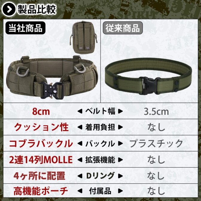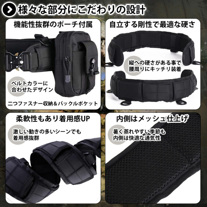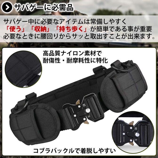 | ・ワンタッチで脱着が可能なコブラタイプのバックルで格好良く、MOLLEベルトはスリムでスタイリッシュなタクティカルベルトです。パッドとベルトは取り外し可能です。 |