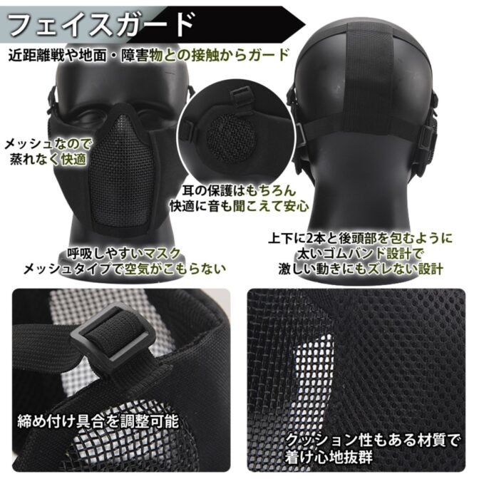 | 耳保護メッシュは音も聞こえやすくゴムバンド2本で調節ベルトの締め付け具合を調節可能。サバイバルゲームでの激しい動きにも安心です。 |