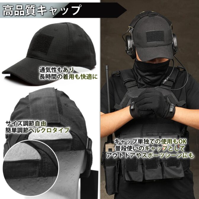 | 帽子サイズは54cm~61cmまで調整可能です。3カ所にベルクロがありサバイバルゲームでのチーム分けカラーやオリジナルワッペンなど取り付け可能です。 |