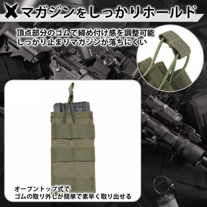 オープントップはマガジンを素早く取り出せる事が出来、また頂点のゴムで締め具合を調節出来るのでしっかり止まりマガジンが落ちにくいので安心してサバゲーを楽しめます。